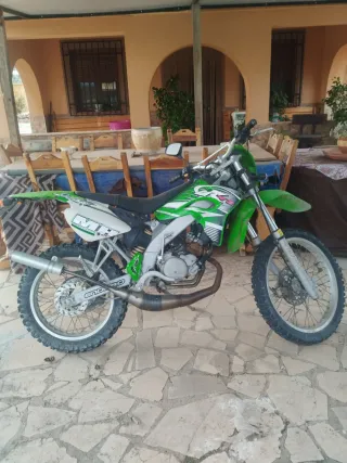 Moto de estilo Enduro y Motocross con una combinación de colores verde y blanco. - Diseño deportivo. - Ruedas todoterreno. -Tubo de escape Jassuni, prácticamente nuevo. -Dos carburadores uno de 20 y un 12. -Mas otro tubo de escape. -Seguro recién pagado . -ITV al día . -Casco a juego con la moto.