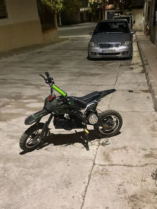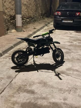 Moto eléctrica estilo motocross en llamativos colores negro y verde. Ideal para diversión y aventura. - Diseño deportivo. - Manillar con puños de color verde. - Ruedas todoterreno. Precio negociable se puede probar
