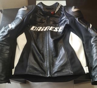 Chaqueta de cuero Dainese para moto, en excelentes condiciones. Es una prenda elegante y cómoda, ideal para cualquier motorista. - Talla: 52 - Color: Negro y blanco - Material: Cuero y tejido - Protecciones en hombros y codos