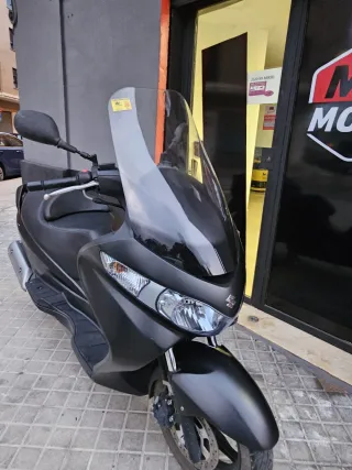 Suzuki Burgman 200 en color negro. - Diseño moderno y deportivo. - Asiento cómodo para dos personas. - Parabrisas alto para mayor protección. - Ruedas de aleación.