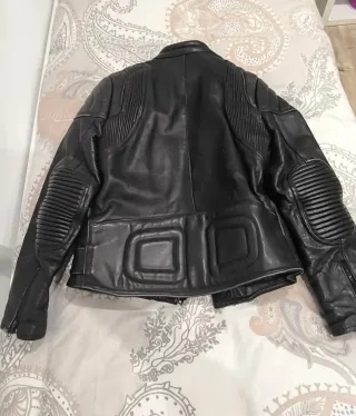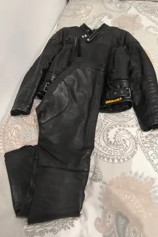 Conjunto de chaqueta y pantalón de cuero para moto de la marca Garibaldi. - Chaqueta de cuero negra. - Pantalón de cuero negro. - Talla 50.