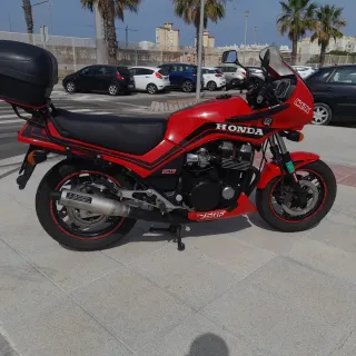 Moto clásica Honda CBX de 750cc en color rojo. - Diseño deportivo y líneas agresivas. - Incorpora maleta trasera negra. - Escape LASER.
