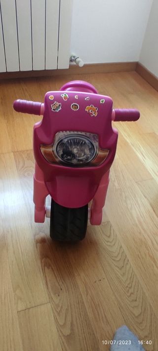 Moto infantil a batería con diseño de Hello Kitty. - Color rosa y rojo. - Ruedas grandes para mayor estabilidad. - Asiento cómodo.no tiene motor de le quito