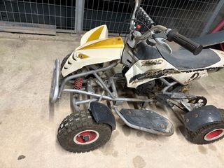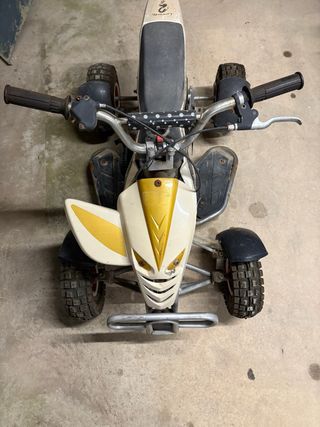 Mini quad para niños con un diseño llamativo y deportivo. - Carrocería en blanco y amarillo. - Ruedas todoterreno. - Manillar con puños. - Asiento acolchado.