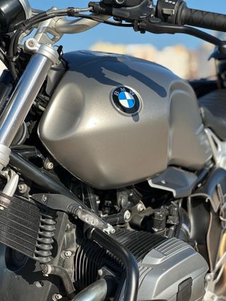 Moto BMW R nineT Scrambler en color gris. Un estilo clásico con un toque moderno. - Depósito de combustible gris metalizado. - Cubre Carter. - Ruedas de radios. - Escape Akrapovič.