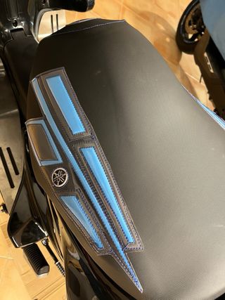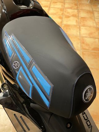 Asiento para Yamaha Aerox, con un diseño moderno y detalles en azul y gris. - Tapicería negra con costuras en azul. - Diseño deportivo con detalles gráficos. - Logo de Yamaha visible. Tapizado de hace un mes y dos dias de uso esta completamete nuevo