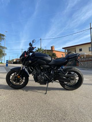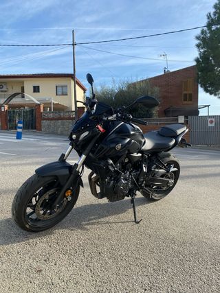 Moto Yamaha MT-07 en color negro del 10/2023, con garantía hasta el 10/2026. Moto muy cuidada, siempre garaje y todas las revisiones al día en taller oficial de Yamaha. - Menos de 13.000kms - Limitada para el A2 - Pantalla TFT con conectividad bluetooth - Preinstalación del quickshifter - Color tech black - Extras: cúpula delantera original yamaha, portamatriculas corto original yamaha (entrego el de serie), escape y colectores SC project (entrego todo lo de serie) y topes anticaida Pelacrash - Solo tiene dos pequeñas marcas que se ven en la foto Se vende por cambio a moto del carnet A