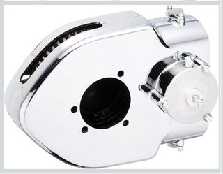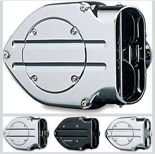 Filtro de aire Kuryakyn Hypercharger para motocicletas Harley-Davidson estilo cruiser. Diseño cromado. - Acabado cromado brillante. - Diseño de doble entrada. - Cubierta circular con tres ranuras.