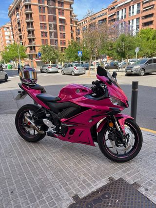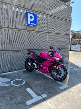 Esta Yamaha R3 en color rosa es una moto deportiva con transmisión manual, ideal para el carnet A2 - Diseño deportivo. - Color rosa vibrante. -Todas las piezas originales las tengo. -Portamatricula corto (tengo el original) -Escape no homologado (tengo el original) -9.800km -2023 -revisiones hechas -manual de la moto -Mitad negra mitad rosa -42 cv La vendo por cambio de cc Siempre guardada en garaje TIENE LOS ALERONES PUESTOS PERO LE FALTA UNO