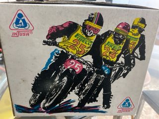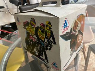 Casco de juguete para moto de estilo motocross.años 70/80 a estrenar en caja - Diseño con gráficos de corredores y números. - Incluye logo de la marca Injusa.