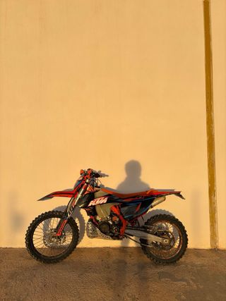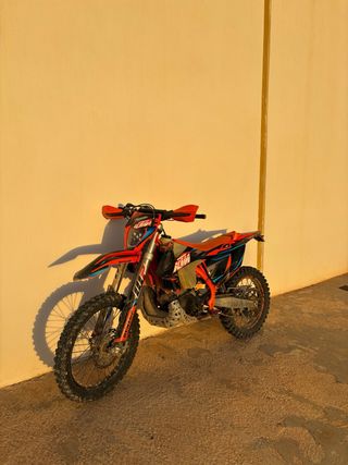 -Mousse michelin en las 2 ruedas. -Ruedas metzeler delante al 90% atras al 60% -Protector radiadores -Cubremanetas cerrados grupo ktm -Cubrecarter -Protector de bufanda de escape. -Protector tapa motor -Protector basculante -Tirador delantero -Foco led -Todo el kit de itv. -Recambio discos de embrague sin estrenar. -Piña de luces nueva -Puños nuevos -Kit de pegatinas six days chile 2019. -Asiento antideslizante -Piston hecho a las 200h -Horquillas y amortiguador con mantenimiento recien hecho. -Fibra del silenciador recien cambiada. -Arranque electrico (corona, motor, bendix, cableado) nuevo pero falla. -No lleva itv. (Cambio por sm