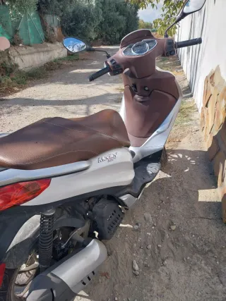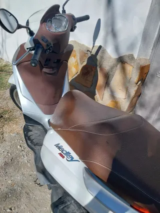Moto scooter Medley ABS en color blanco con detalles en marrón.Itv al día.. revisión recién hecha neumáticos cambiados,se puede ver factura,ningún rasguño.año 2019,precio algo negociable .Tlf 647899176 Isabel,solo personas realmente interesadas . - Diseño moderno y elegante. - Asiento cómodo en tono marrón. - Logo 'Medley ABS' visible.