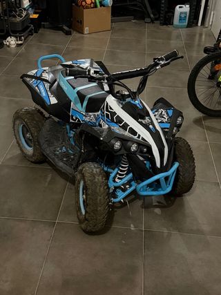 Quad eléctrico infantil con motor de 1000W. Diseñado para los más pequeños, ofrece una experiencia divertida y segura. - Potencia de 1000W. - Diseño deportivo en colores azul y negro. - Ruedas todoterreno.