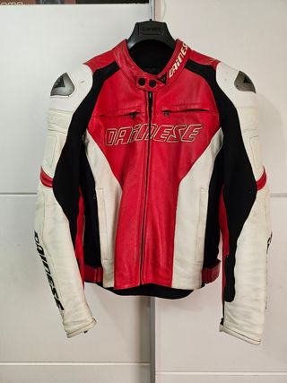 Chaqueta de moto Dainese de cuero, roja y blanca. Está en buen estado, aunque presenta algunas señales de uso. - Talla:) - Marca: Dainese - Material: Cuero - Color: Rojo y blanco