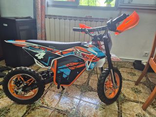 Mini moto eléctrica con un diseño deportivo y llamativo9 - Color naranja y negro con detalles gráficos. - Ruedas todoterreno para mayor agarre. - Manillar con protectores naranjas. -Dos juegos de llaves -Muy poco uso.