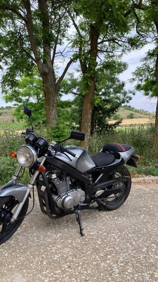 Motocicleta Kawasaki ZZR250 Ninja en color plateado y negro. Diseño deportivo clásico. 65000km Se entrega con: Aceite y filtros recién cambiados Pastillas de freno delanteras y traseras nuevas. Líquido de frenos nuevo Anticongelante nuevo Reglaje de válvulas recién hecho Bujías recién cambiadas Perfecta para A2, 175km/h vel max, cruceros de 150km/h perfectamente Se podría llevar la moto a cualquier sitio de España bajo compra