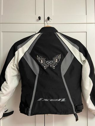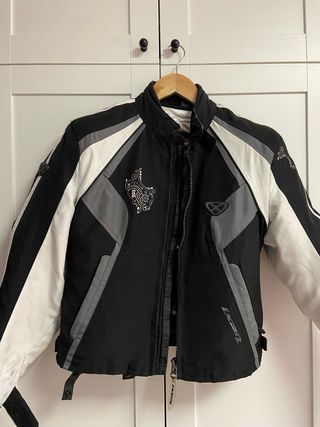Cazadora de moto para mujer de la marca IXON. Diseño moderno y funcional. - Color negro, blanco y gris. - Detalles plateados. - Cierre de cremallera frontal. Esta puesta tres veces, la talla es 4 que equivale cono a una XS, trae forro de invierno y las prtecciones