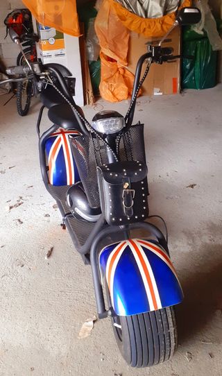 Se venden piezas para ciclomotor eléctrico Citycoco. Ideal para reparaciones o repuestos. - Guardabarros delantero con diseño Union Jack. - Batería. - Asiento. - Ruedas. - Manillar. - Faro delantero. - Amortiguadores traseros.