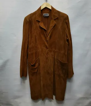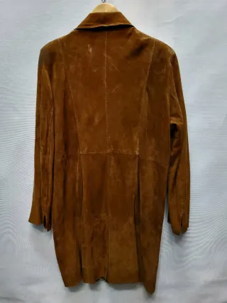 Abrigo largo de ante en color marrón. Presenta un diseño clásico con solapas y cierre de botones. - Material: Ante - Color: Marrón. - Bolsillos frontales. - Cierre de botones. 66cm.Manga. 94cm.Largo. 114cm.Pecho.