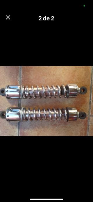 Par de amortiguadores cromados para moto custom. Listos para instalar. - Acabado brillante. - Diseño clásico.