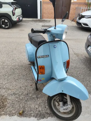 Moto Vespa clásica en color azul claro. Un modelo icónico para disfrutar de la ciudad. - Diseño retro. - Asiento negro. - Rueda delantera de 10 pulgadas. Año matriculación 1990