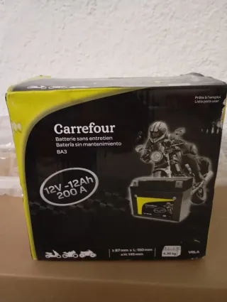 Batería de moto Carrefour sin mantenimiento. - Voltaje: 12V - Capacidad: 12Ah - Corriente de arranque en frío (CCA): 200 A - Dimensiones: 87mm x 150mm x 145mm - Peso: 4.36 kg - Tipo: VRLA