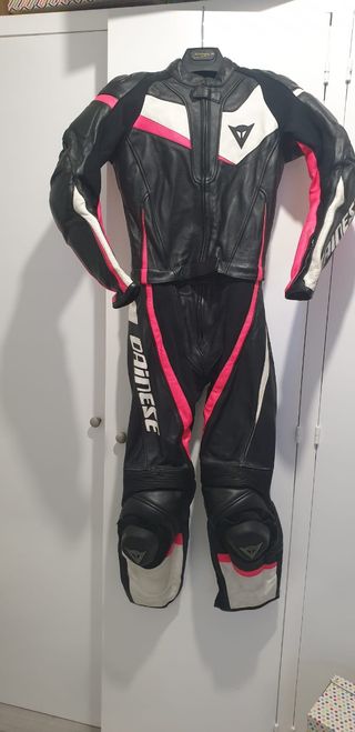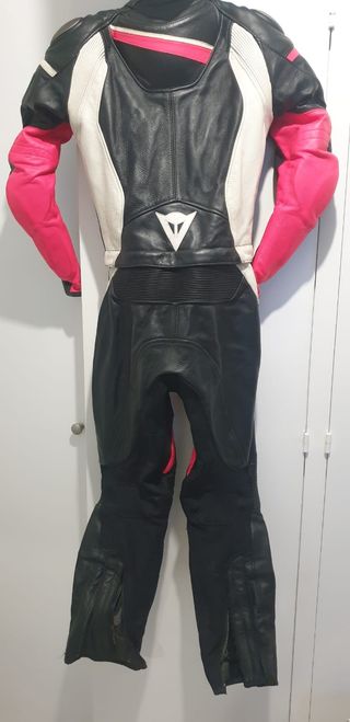 Mono de dos partes de cuero Dainese de mujer. Talla 34-36 de pantalón. Tiene protectores en hombros, codos y rodillas.Está nuevo, me lo he puesto 3 veces.