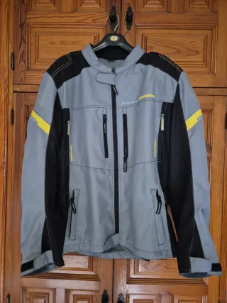 Cazadora de moto de carretera en excelente estado, prácticamente nueva. Diseño moderno y funcional. - Color gris con detalles en negro y amarillo. - Cierre de cremallera frontal. - Múltiples bolsillos con cremalleras y ventanillas de aire. - Con todas sus protecciones, espaldera, hombros y coderas. - Cintura elástica y puños ajustables.