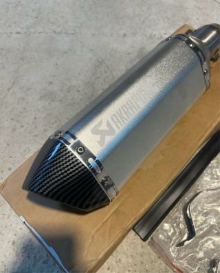Silencioso de escape Akrapovic con acabado en carbono y plata. - SE ENVIA (preguntarme) - Diseño cónico con punta de carbono. - Cuerpo principal plateado con logo grabado. - Abrazaderas de sujeción incluidas. - nuevo a estrenar