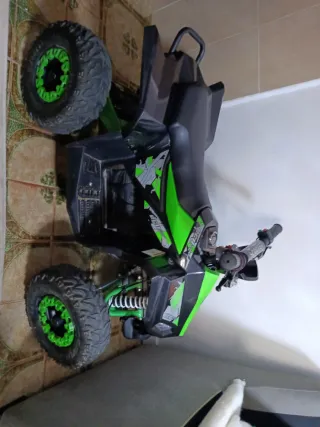Moto eléctrica infantil con un diseño deportivo y llamativo en color verde y negro. Moto buen estado y funciona todo bien no tiene nada roto. Vivo en Sevilla. las letanías - Ruedas todoterreno. - Suspensión delantera. - Manillar con puños de goma.