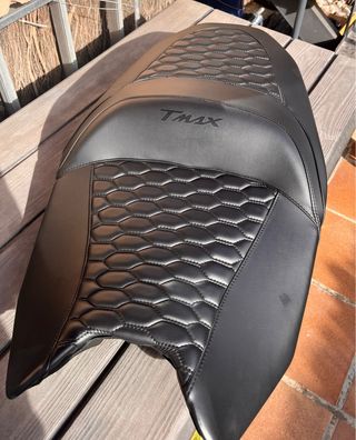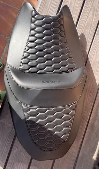 Asiento de moto T-Max con un diseño moderno y acolchado. - Tapicería negra. - Detalle de costuras hexagonales. - Logo T-Max grabado.