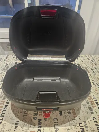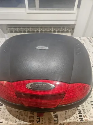 Baúl Givi para moto, ideal para transportar tus pertenencias. Incluye plataforma y soportes. - Marca: Givi - Color: Negro - Incluye plataforma de montaje - Incluye soportes para moto