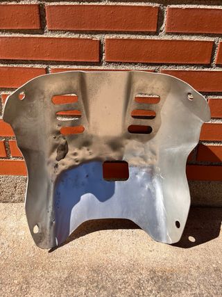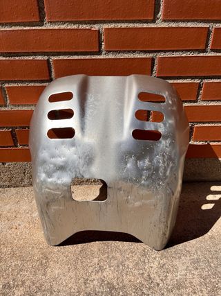 Protector de cárter para moto Kawasaki Kle 500. Fabricado en metal plateado. - Diseño con ranuras de ventilación. - Apertura frontal para acceso.