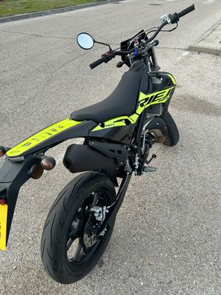 Moto Rieju MRT 50 con un diseño llamativo en negro y amarillo. Comprada en 2025 y con itv hasta 2028 -Ruedas Supermotard -Kilometraje aprox 1900km -Muy bien cuidada, siempre ha dormido en garaje -Tiene el kit de deslimitacion de Rieju puesto -Se vende con las piezas de serie -Esta practicamente nueva PRECIO NEGOCIABLE