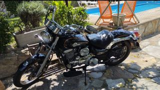 Moto Daelim Daystar en color negro mate. - Diseño custom. - Asiento doble. Recién tapizado el trasero. - Maletas laterales. Alforjas de cuero. - mantenimiento echo en taller oficial. - 24400 km - Falta pasar ITV por falta de dinero.