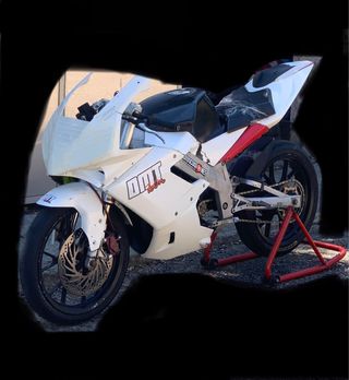Moto Derbi GPR 50 preparada para circuito. Preparación de motor: -Cilindro Airsal 74 -Carburador de 28mm -Escape yasuni -Esta recien carburada -Aceite de caja cambiado con una tanda El resto de la moto -slicks de moto 3 -bomba de freno delantera hyosung 600 -latiguillos metalicos pastillas delanteras nuevas Habria que acabar la moto de estetica,( hacer bien todos los carenados) pero de mecanica esta lista para rodar, los plasticos no se hicieron porque se usaba sin ellos en karting Precio negociable