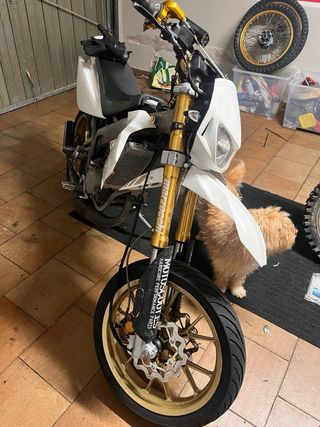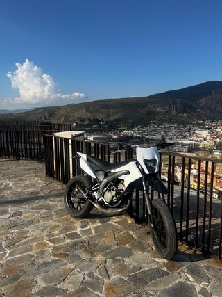 Modelo supermotard. Actualmente toda negra, con cadena y bordes de llantas naranja. Extras: Centralita, Desarrollo (piñon, plato y cadena) y escape (Kit Yasuni deslimitado bajo). Tira mucho. Retrovisor antimultas de puño. Hay todas las piezas originales para pasar la ITV sin ningún problema. Recien pasada revision completa, cambiado aceite motor, bomba de refrigeración, batería nueva, niveles..etc (todo con facturas tanto los extras como los mantenimientos). ITV en vigor 09/2026. Toda la documentación original e impuestos y seguro al día. Muy poco negociable. Se puede probar. Peñíscola.