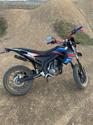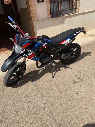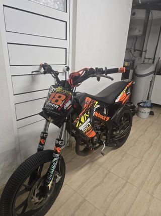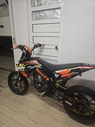Moto de 49cc estilo supermotard con 11700km nunca ha sido trucada, lo unico que se ha hecho es deslimitarla. Siempre ha dormido bajo techo. Moto siempre bien cuidada y con recorridos cortos. Solo tuvo una caída y fue en parado al intentar apoyar el pie en un bordillo, solo afecto a la maneta izquierda. La vendo por cambio a moto A2, la moto se usa de diario - Gráficos personalizados. -Estado impecable -Itv 2027 -Va de serie -Espejos bajo el manillar ( tambien se da el original) -Filtro de aire nuevo -Cable del acelerador nuevo -Bujia nueva -Cadena recien tensada y engrasada -Completamente lista para usar Precio negociable