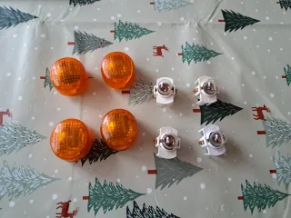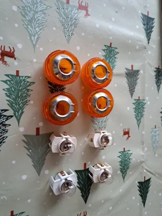 Conjunto de tulipas de intermitente naranjas y sus bombillas. - 4 tulipas naranjas con embellecedor plateado. - 4 bombillas con casquillo blanco.