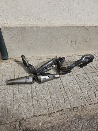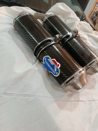 Sistema de doble escape de la marca Termignoni para motocicleta. Fabricados con detalles en fibra de carbono y acabado negro mate. - Diseño deportivo. - Logos de la marca visibles. - Conexiones metálicas.
