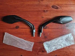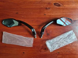 Par de espejos retrovisores negros para motocicleta. Diseñados con un estilo en metal moderno y elegante. - Estilo gota de lágrima. - Movilidad de ángulo de la lágrima. - Brazo curvo para mejor visibilidad. - Incluye tornillería para montaje.
