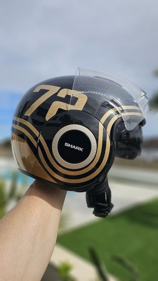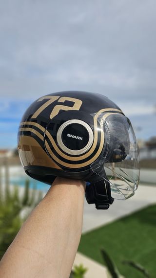 Casco de moto SHARK con un diseño llamativo. Talla XS. - Muy buen estado, como nuevo. Solo tiene una pequeña raya que muestro en la ultima foto. - Color principal negro con detalles dorados. - Estilo scooter. - Visera transparente.