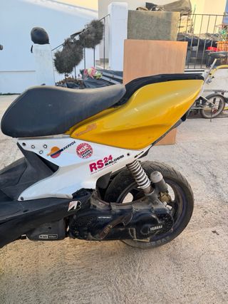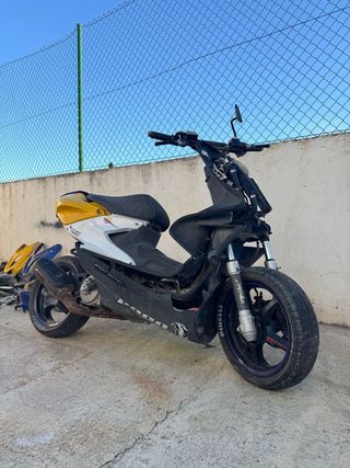 Scooter Yamaha Aerox 49cc Tuve un accidente con ella hace 3 años y esta parada desde entonces, la moto iba perfectamente y el motor se había hecho hace poco... totalmente de serie, por lo que ha rodado poco y no seria difícil hacerlo arrancar. El chasis esta siniestro, así que se vende sin papeles ni matricula. Como veis, hay muchas piezas extra (otro juego de chapas, un cuatrifaro (bifaro) muy dificil de encontrar, un tubo de escape yasuni R, otra tapa de motor, etc.) NO SE HACE DESPIECE, se vende todo junto. No tengo furgoneta ni remolque, el que este interesado que venga y se lo lleve todo. La moto se encuentra en IBIZA.