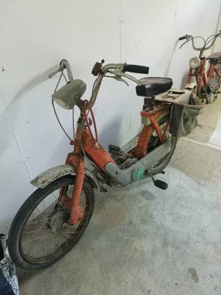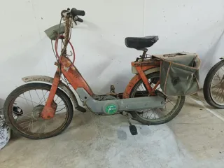 Sin documentación pero con matrícula Ciclomotor clásico Piaggio en tonos naranja y gris. Un modelo con estilo para coleccionistas. - Diseño retro. - Asiento negro. - Bolsas laterales de tela.