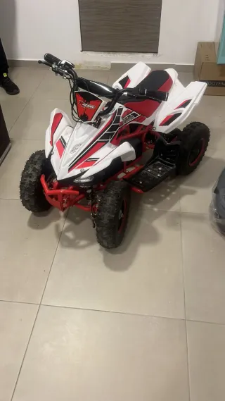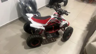 Quad eléctrico infantil con diseño deportivo. - Color blanco, rojo y negro. - Ruedas todoterreno. - Manillar con puños. - Asiento acolchado. Está completamente nuevo, mi niño lo ha usado 3 veces por qué vivo en un 5º y no puedo subirlo y bajarlo. Regalo traje y protecciones.