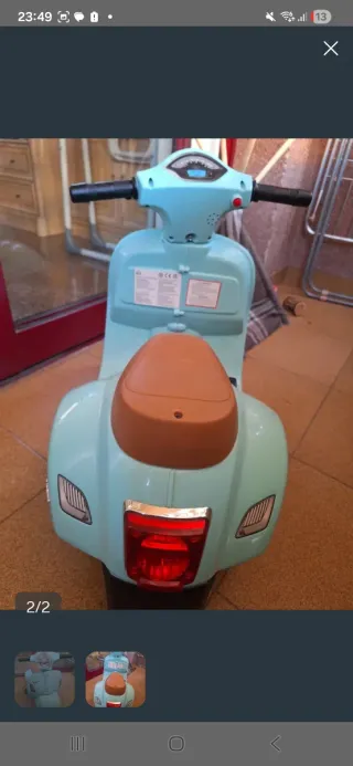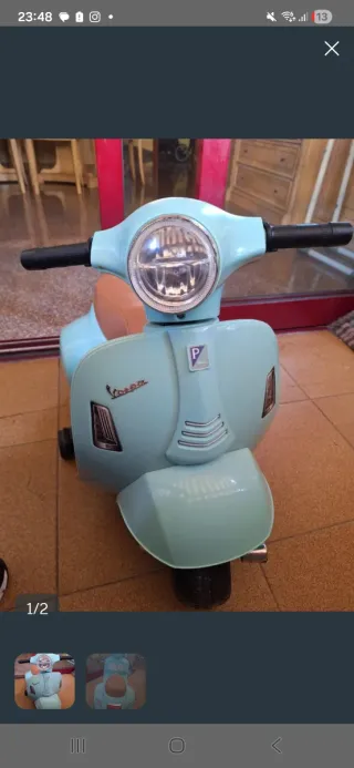 Divertida moto Vespa de juguete, ideal para los más pequeños. Su diseño clásico la hace muy atractiva. No incluye cargador, funciona perfectamente. - Ruedas resistentes. - Asiento cómodo. - Manillar con puños. - Espejos cromados.