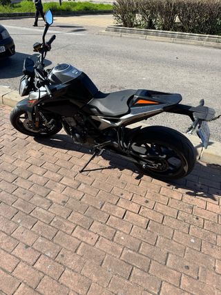 Moto KTM 790 DUKE L ABS en color negro y naranja. - 95 CV limitada A2 -TRACK PACK y QUICKSHIFTER - 10.000 kms (se sigue usando) - Revisión con cambio de rueda pasada en febrero con 8700km - Escape IXIL - Se entrega con cupula, escape de serie, asiento pasajero. - Revisiones pasadas en KTM menos la ultima. - Sin el tipico problema de goteo de refrigerante o aceite