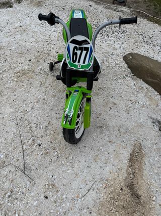 Moto eléctrica infantil estilo cross, color verde y con el número 677. - Diseño deportivo. - Ruedines de apoyo.