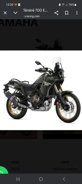 Vendo mi Yamaha Ténéré 700 Explorer en perfecto estado, con solo 20.000 km. Extras y accesorios incluidos: • Cubrecarter de alta resistencia • Protector de motor • Juego de maletas laterales blandas originales Yamaha • Asiento rebajado + asiento original • Kit de bieletas + originales • Puños calefactables • Adaptador Bag Explorer • Horquilla delantera KYB • Garantía extendida vigente ✅ Revisiones al día en concesionario oficial ✅ Se puede probar sin compromiso ✅ Entreg