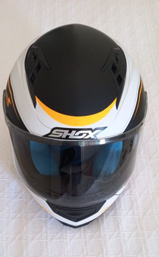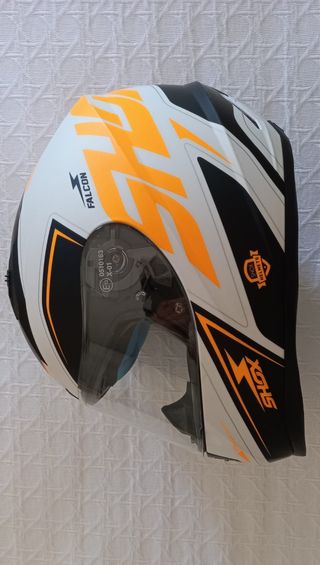 Casco de moto integral Shox Falcon, en perfecto estado. - Diseño deportivo y moderno. - Color blanco y negro con detalles naranjas. - Incluye visera transparente.